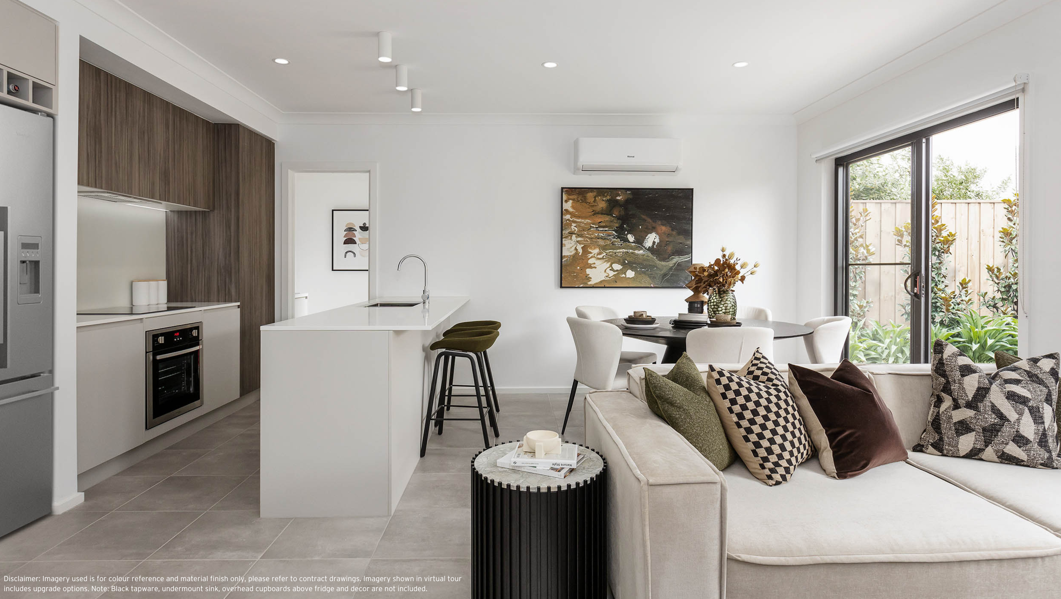 Disclaimer: Imagery used is for colour reference and material finish only, please refer to contract drawings. Imagery shown in virtual tour includes upgrade options. Note: Black tapware, undermount sink, overhead cupboards above fridge and decor are not included. Virtual tour shows Capri 19 at Redstone, Sunbury and is indicative only of final outcome.